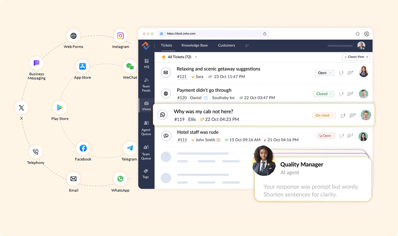 - Multi-channel support (email, chat, remote assist)